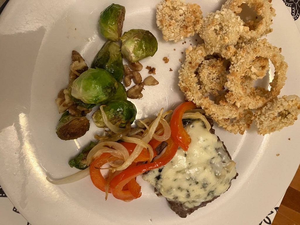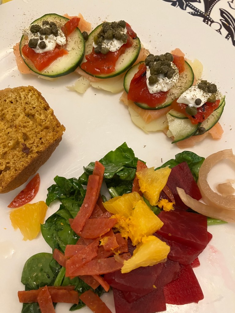 Foods Fun food day at home July 21, 2025July 23, 2025 Anne DoyleLeave a comment Lunch: smoked salmon on round of potato topped with cucumber, roasted red pepper, sour cream, capers, dill accompanied by a salad of wilted spinach, orange segments, beets, crispy pepperoni dressed with orange vinaigrette, and a pumpkin muffin Supper: baked onion rings, cheeseburger with sautéed onions and red pepper, Brussels sprouts with walnuts Dessert: lime pie